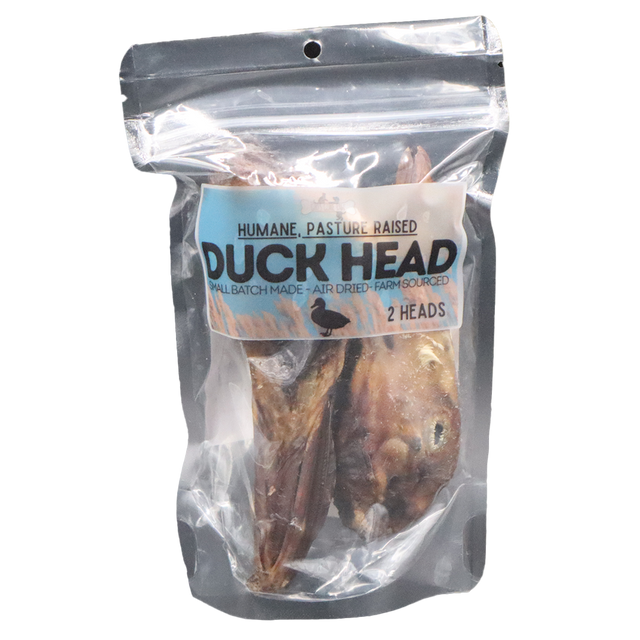 Humanely Pasture Raised! Dehydrated Duck heads make a crunchy, nutritious treat for all sizes of dogs.