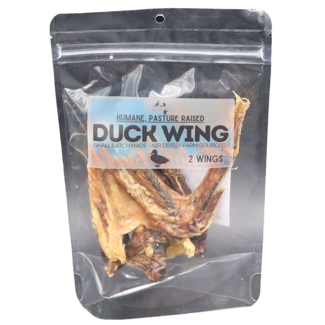 Dehydrated Duck Wings make a tasty medium chew! These ducks are humanely & Pasture raised without hormones, Antibiotics, or GMO feed.