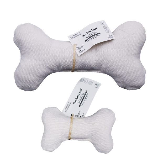 This hemp dog bone toy is for gentle chewers that just love to have something soft to hold on to or cuddle with. Ditch the polyester and poly filled plush toys and check out this organic dog bone made with hemp and 100% organic cotton filling and thread. This hemp bone for dogs contains zero toxic dyes and is completely squeaker free. This soft dog bone toy is great for both play and cuddles.