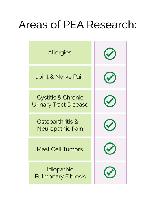 Research has shown PEA to have a strong safety profile. The daily dose can be doubled if needed. Discontinue use if any GI upset is seen or you suspect your pet is not tolerating it well.