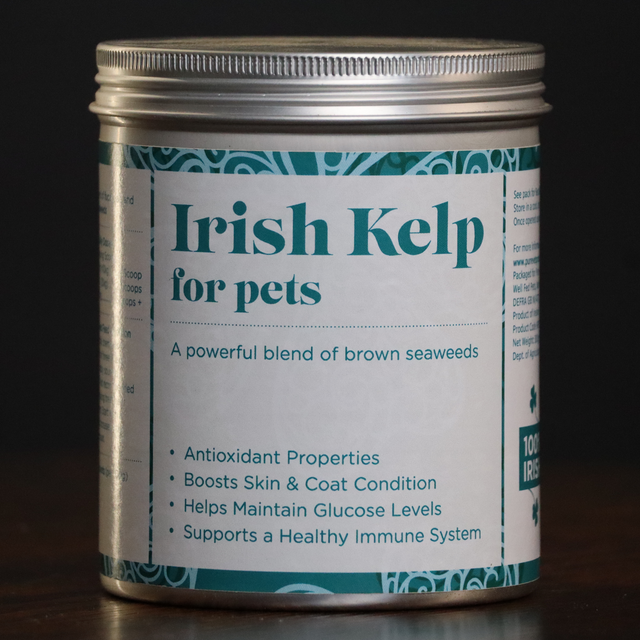 Formulated by our friend, Dr. Conor Brady, and made in Ireland, Kelp For Dogs is a natural supplement which contains a brown seaweed (Laminaria, a.k.a. kelp). Kelp is packed full of powerful antioxidants such as fucoidans